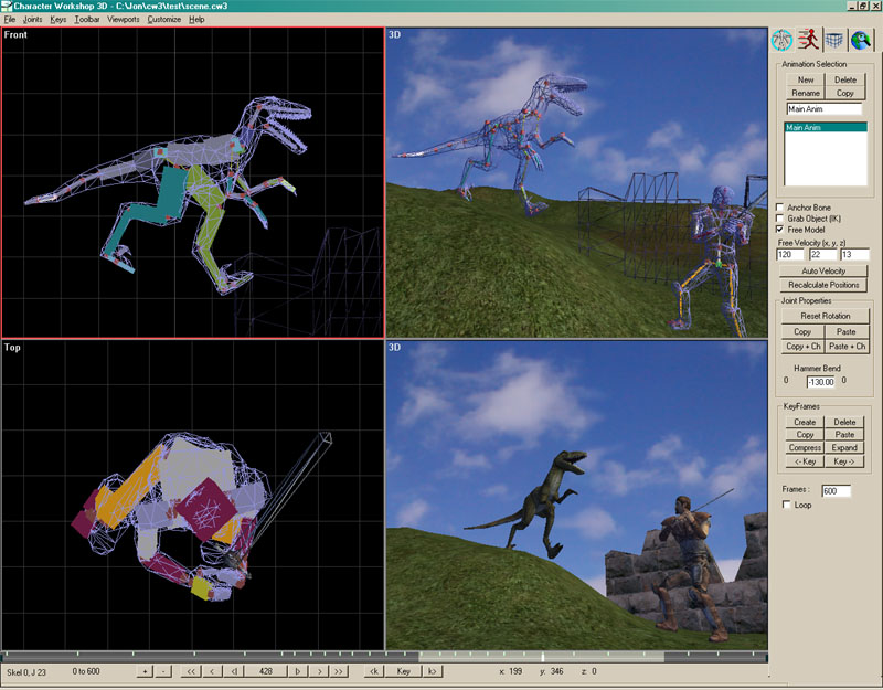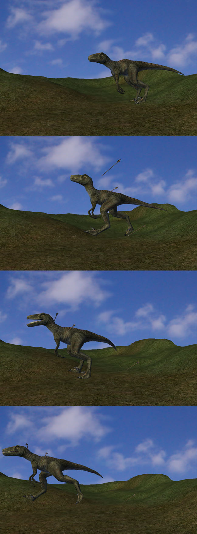None of this is complete, but some parts are closer than others. I've never done any serious animation work before, and I'm still learning how create good animations, but I'm getting much better. The high-res Raptor mesh is just a smoothed low-res one, the warrior has a more developed but still unfinished high-res model. The backgrounds are a bit sparse right now for lack of available art. The sky in particular is just one unchanging 2D texture map, need to update that soon.