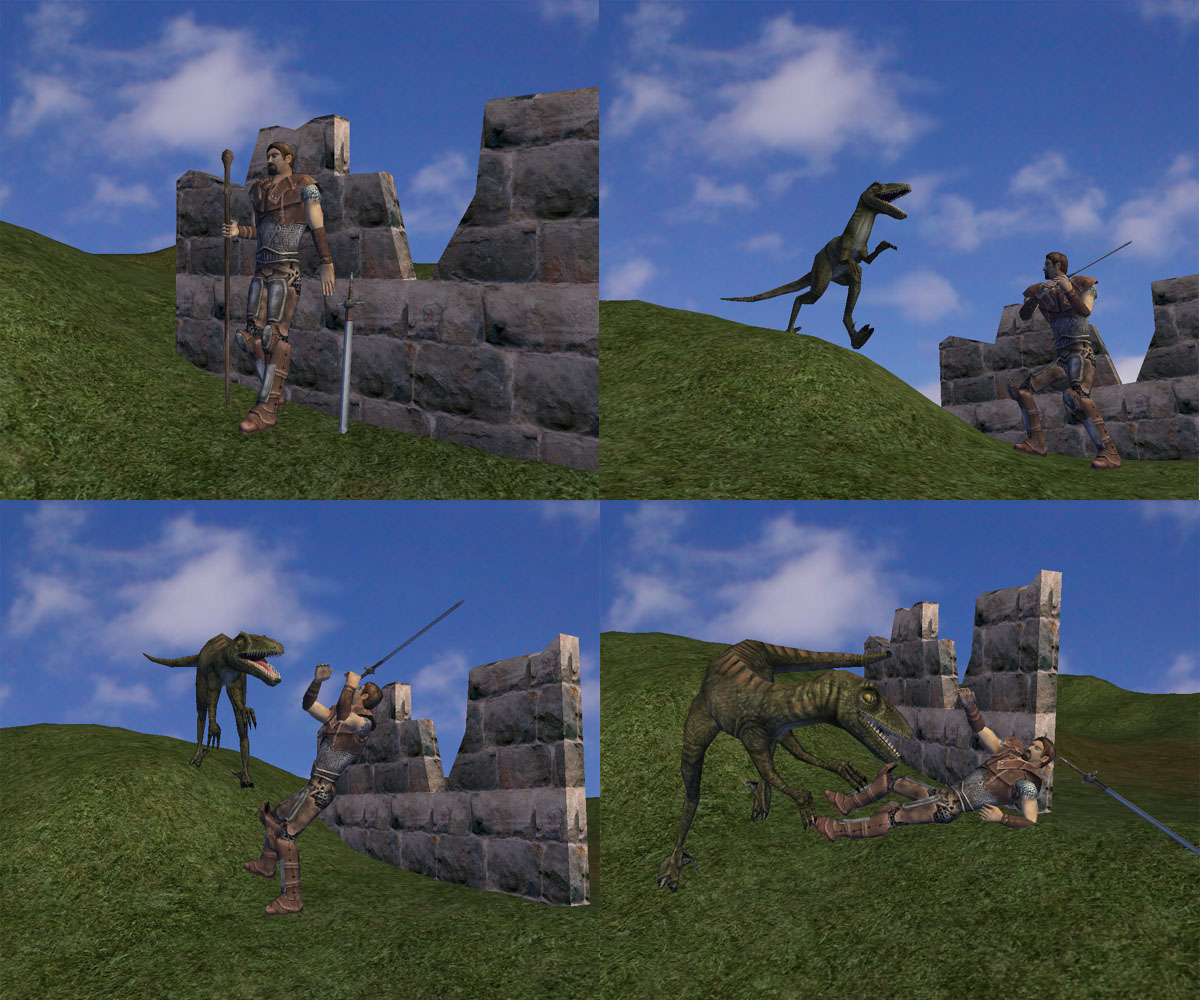 Warrior meets Raptor, gets ready to swing his sword, and chickens out.